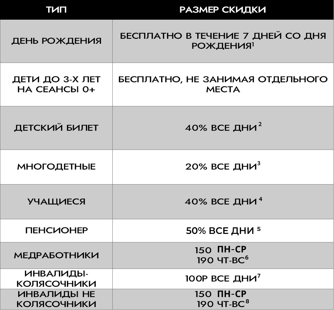День рождения: получить бесплатный билет ко Дню Рождения можно только 1 раз в кинотеатре, у администратора, в сам День Рождения или в один, любой, из 6-ти последующих дней. Бесплатный билет нельзя приобрести или забронировать онлайн. Бесплатный билет действует только на сеансы, демонстрируемые в день выдачи бесплатного билета. Гостю необходимо предоставить администратору, на стойке информации, оригинал или нотариально заверенную копию документа, удостоверяющего личность (паспорт, водительское удостоверение, свидетельство о рождении). Бесплатный билет не предоставляется на фильмы, демонстрируемые в залах Black, на театральные постановки/оперу/балет/трансляции и на премьерные показы.